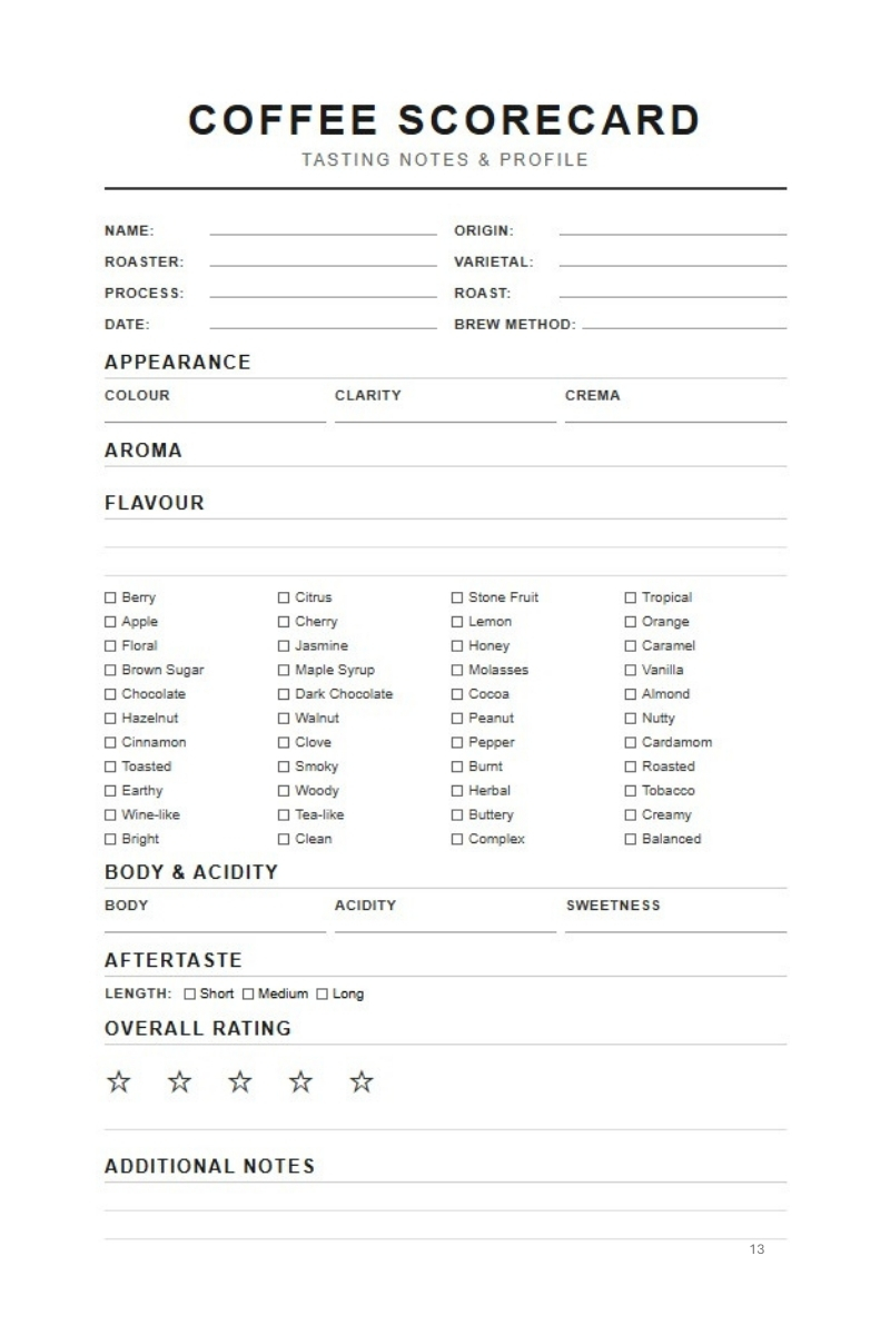 Explore single-origin coffees, blends, and different roast levels with structured scorecards, a clear flavour wheel, and space to build your own reference over time.