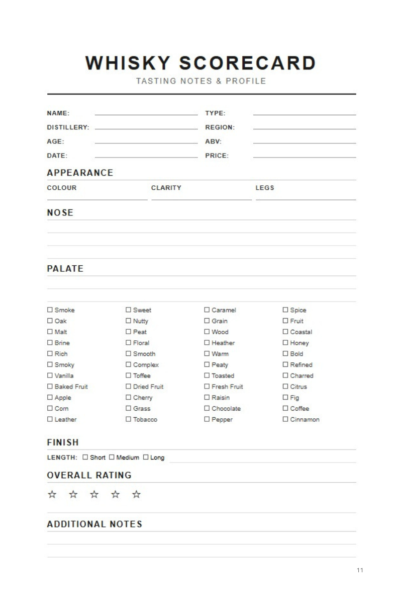 A thoughtfully designed whisky tasting journal for recording what you taste and how you experience it. Track Bourbon, Scotch, rye, and more with structured scorecards, clear flavour wheels, and space to build your own reference over time.